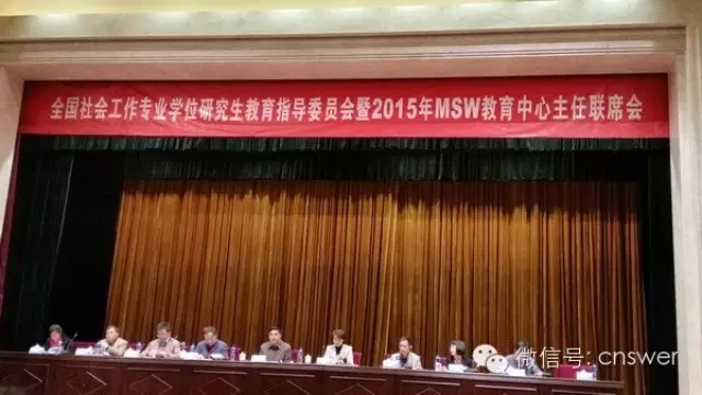 2015年12月5—6日,“全国社会工作专业学位研究生教育指导委员会暨2015年MSW教育中心主任联席会议:MSW学位教育的建设与发展”在北京西郊宾馆举行。会议主要内容为:2015年全国MSW授权点专项评估工作总结;交流和讨论社会工作专业学位研究生培养模式改革的意见和建议;讨论社会工作专业学位研究生学位论文基本要求;案例教学研讨;MSW教材编写。